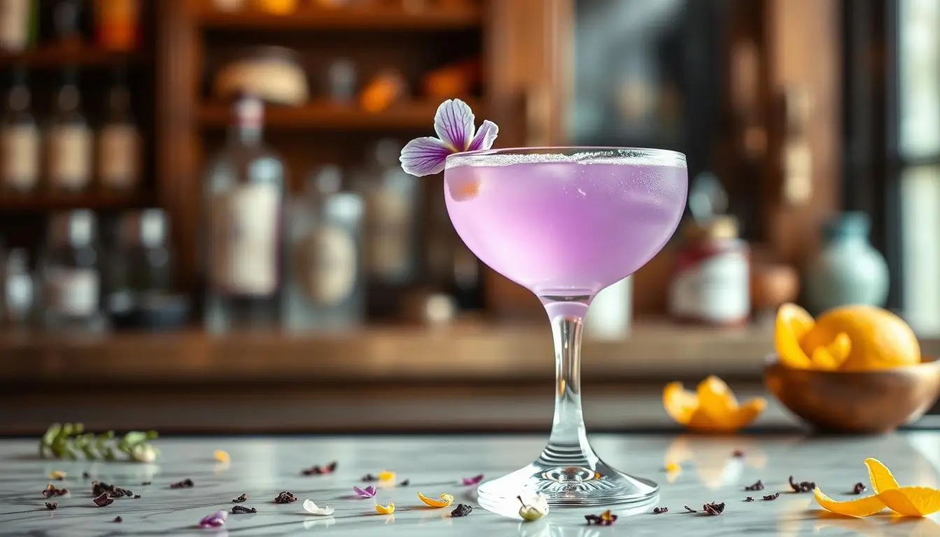 This cocktail is special because it balances many flavors. With 1.5 oz of top-notch gin, a bit of maraschino liqueur, fresh lemon juice, and a hint of violet liqueur, it offers a unique taste. It feels both old and new at the same time.