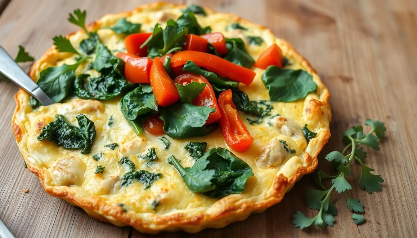 Chicken frittata is also full of vitamins and minerals. Eggs give you vitamins B12, A, and D. The veggies add fiber, antioxidants, and minerals like iron and potassium.