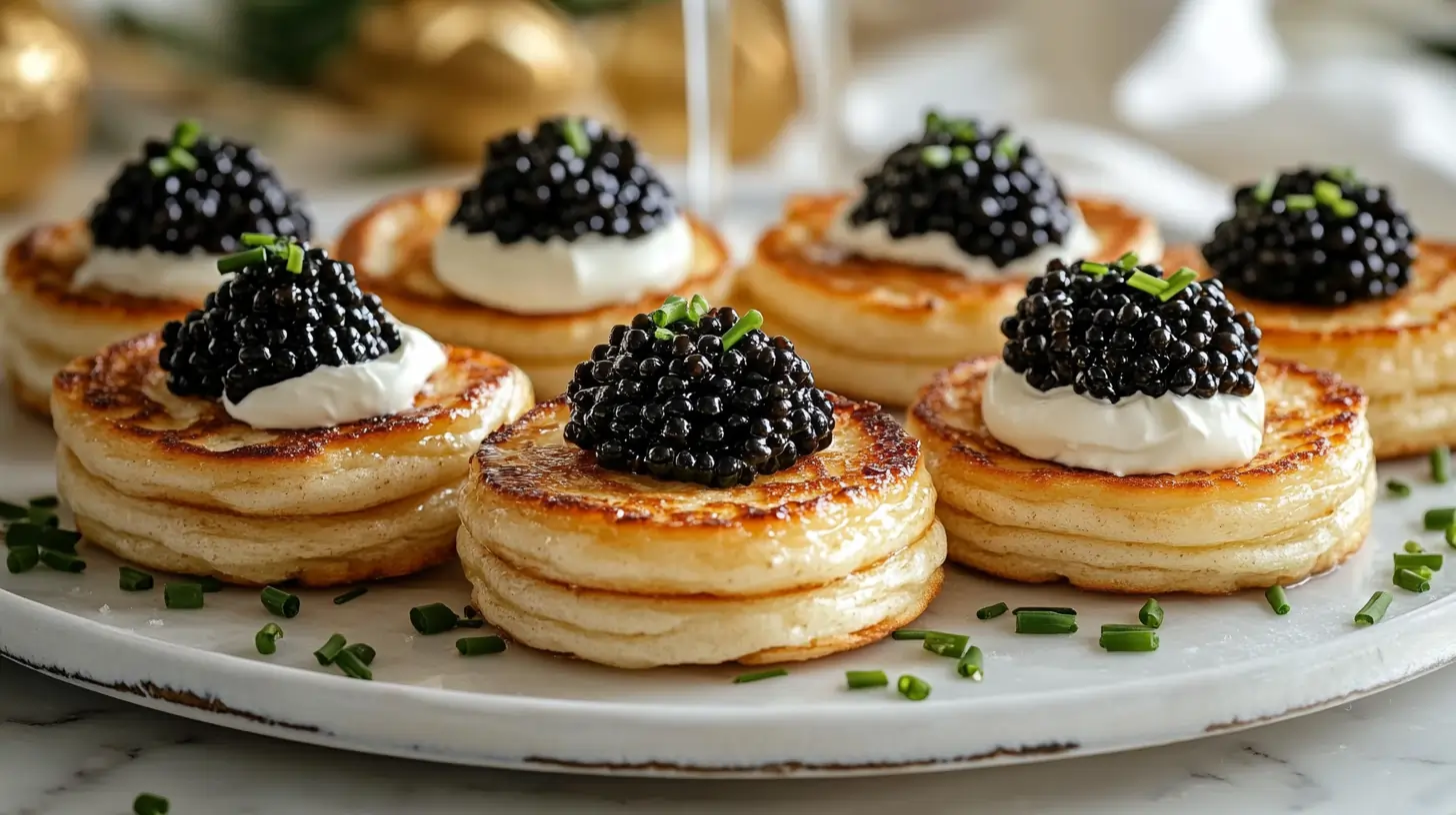 Caviar-Topped Blini | Delicate blini serve as the base for a generous portion of high-quality caviar, creating a delightful flavor and texture contrast. |