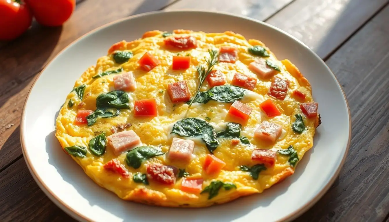 - This protein-packed dish combines eggs, ham, cheese, and vegetables for a filling meal.