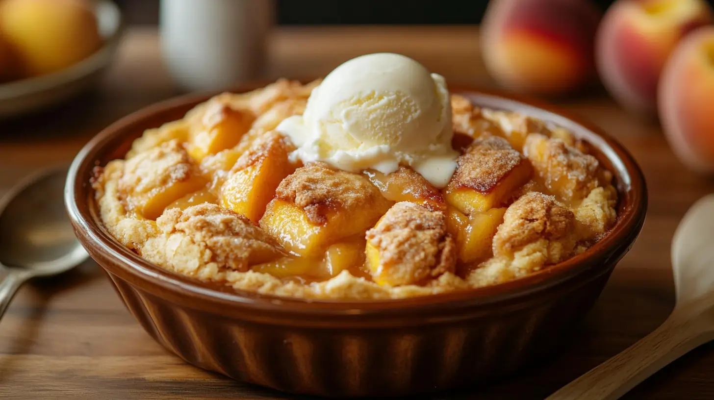 A beautifully baked peach cobbler with a golden, crispy cake mix topping, warm and bubbling, served in a rustic dish, surrounded by fresh peaches and a scoop of vanilla ice cream on the side, set on a wooden table with warm, inviting kitchen elements in the background.